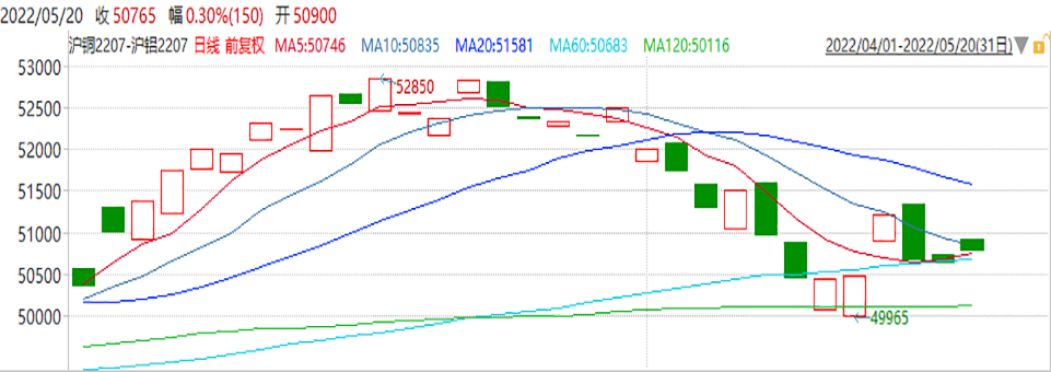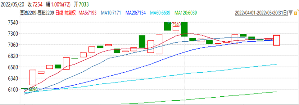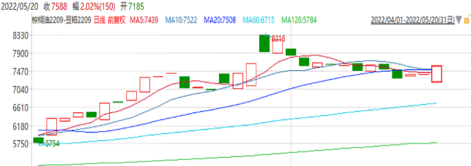 沥青冲高回落,高位震荡。日k线整体呈上行趋势,近期突破3700-4000箱体震荡。下方10日均线有支撑作用,建议多头思路操作,注意前高附近压力。原油高位回落,收中阴线。600附近是重要支撑,日k线在600上方附近低点逐渐抬升。整理三角形形态有向上突破迹象,调整不改趋势方向,后市仍建议偏多思路看待。橡胶尾盘回落,收小阴线。日k线整体呈下行趋势,沿着趋势线缓慢下行。反弹或提供进场时机,建议多头思路操作。玉米震荡走高,收长阳线。日k线整体呈上行趋势,沿趋势线缓慢上行,下方10日均线存在支撑,建议多头思路操作。截止2022年05月17日,棕榈油港口库存为30.05万吨,环比减少2.3万吨,从季节性来看,棕榈油港口库存位于历史较低水平。国际市场方面,马来西亚独立检验机构AmSpec数据显示,马来西亚5月1-15日棕榈油出口量较4月同期增加29.11%。劳动力短缺仍是制约其棕榈油增产的重要原因,预计5月马来西亚产量或减少,库存可能再度下降。加上印尼首先保证国内棕榈油的供应,未来国际市场棕榈油供应仍处偏紧之中。最新的USDA报告下调阿根廷大豆产量,继续下调2021/2022年度全球及美国大豆结转库存等,报告总体中性偏多,对国际油脂市场利多影响。此外,国际油价因俄乌战争等因素继续保持高位,支撑棕榈油价格。全球最大的葵花籽油出口国乌克兰出口几乎停滞中,可能加剧国际间油脂的紧张。目前国内基差坚挺,对期价构成支持。豆粕方面,进口大豆供应有所加大,国内进口大豆拍卖继续,市场原料供应短缺有所缓解。故可关注该策略。(该套利策略与下面的多豆油空豆粕策略任选其一进行关注。)上周沪铜库存继续小幅回升至55,372吨,但仍位于二十年的相对低位。上周,纽铜库存有所回落,最新库存水平为82,491吨。中国上海疫情形势有所好转,房贷利率下降,市场风险情绪回升,有助于铜需求预期的提振,铜价或将重新获得支撑。沪铝方面,消费暂未恢复至正常水平的情况下,铝价反弹空间暂受限。中国国家统计局发布的数据显示,统计局数据显示:4月份中国原铝产量环比提高0.3%,这也是连续第二个月创下历史新高。因为电力限制放松,有助于冶炼厂提高产量。考虑到目前市场供给端增量释放相较消费端需求更为确定,供给端压力较大,铝价短期仍将承压。若差价下破50000取消关注。锌方面,据了解,截至5月16日SMM七地锌锭库存总量为26.11万吨,本周库存延续去库。国际市场方面,欧洲能源问题所导致的供应端成本支撑犹在。目前市场情绪有所好转,稳增长政策提振市场信心。另外沪锌价格大幅下跌后,目前价格已接近国内外冶炼成本线附近,预计继续向下空间受限。铅方面,LME库存维持低位,但国内库存有所增长。据SMM调研,截止5月16日,五地铅锭库存总量至10.86万吨,库存有所回升。4月全国电解铅产量27.15万吨,环比上升2.88%。4月全国再生铅产量34.91万吨,环比上升19.39%,同比上升13.54% ,2022年1-4月累计同比上升12.31%。随着疫情逐渐得到管控,运输问题得到解决,再生铅方面产量或稳步恢复。需求方面,出口方面受到运输的影响;5月份是更换电池的淡季,蓄电池企业生产订单量偏少,开工率低于去年同期。此外,受疫情影响国内汽车业铅需求量有所下降。若差价下破10000取消关注。因拉尼娜天气导致油料作物的产量下降, 最新USDA报告预计南美阿根廷大豆大幅减产,全球大豆、美国大豆结转库存下降,全球植物油市场面临原料短缺局面。因国际局势动荡,将继续支撑原油价格保持坚挺。俄乌战争也使得全球油脂市场供应紧张加剧,在此背景下预计国际油脂价格易涨难跌。豆粕方面,因国内抛储进口大豆,大豆供应阶段性增加,对豆粕价格上涨起到一定抑制作用,总体走势来看,豆油走势或较豆粕偏强。若下破6850取消关注。