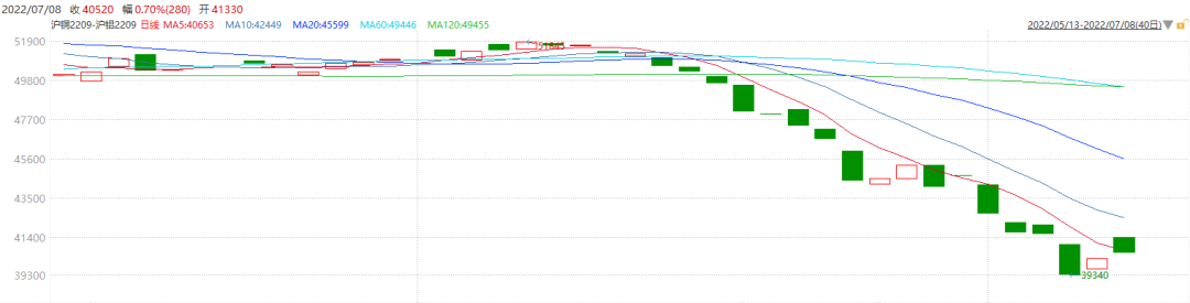 夜盘国际原油期货大幅下跌,加之宏观层面美联储加息背景下商品市场延续弱势表现,以及为应对通胀,美联储加息缩表使得对全球经济前景的担忧加重,在此背景下,铜基本面仍较悲观。随着7月美国经济数据公布以及美联储议息会议临近,市场对加息预期担忧再次升温。受整体市场恐慌情绪影响,铜价再度爆跌。其终端订单的恢复缓慢,库存开始小幅累积,现货升水出现回落。预计铜价仍将延续弱势下行为主。铝市场方面,大的宏观背景下,铝价总体走势也不乐观,但华东市场购销两旺,需求好转,相对低价刺激下游采购。此外,相较铜价走势来看,由于其成本因素,部分冶炼企业出现亏损,成本因素阶段性地对铝价构成支撑,预计下跌中,铝价跌幅或小于铜,反弹时走势或强于铜。策略建议:空沪铜多沪铝09,该策略为最新推出的跨品种套利策略,可在40500适当加以关注。