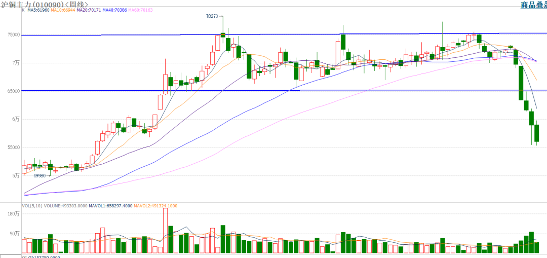 截至前一个交易日收盘,沪铜跳空低开,收类十字星。周k线向下突破震荡区间下边界,或预示长周期沪铜已经转势。日k线自10日均线附近连续回落,下行趋势并未改变。