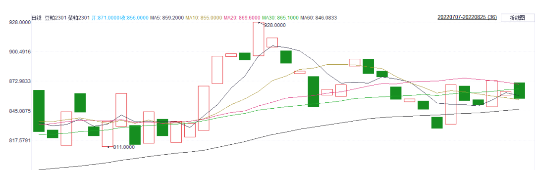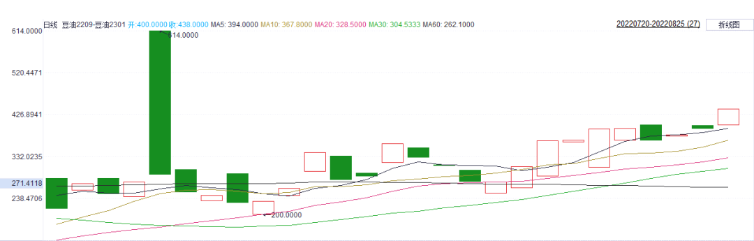 盘面观察,前期近月合约走势较远月合约偏强,短期美豆仍有继续炒作天气升水可能,故可关注做多近月做空远月的正向套利机会。