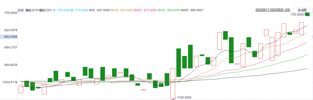从橡胶近、远月差价走势分析,近一个月近、远月合约间差价震荡走强,近月合约价格走势相对远期01合约价格坚挺。预计远期合约受市场不确定影响较大,相较近月合约而言未来或面临较大压力。