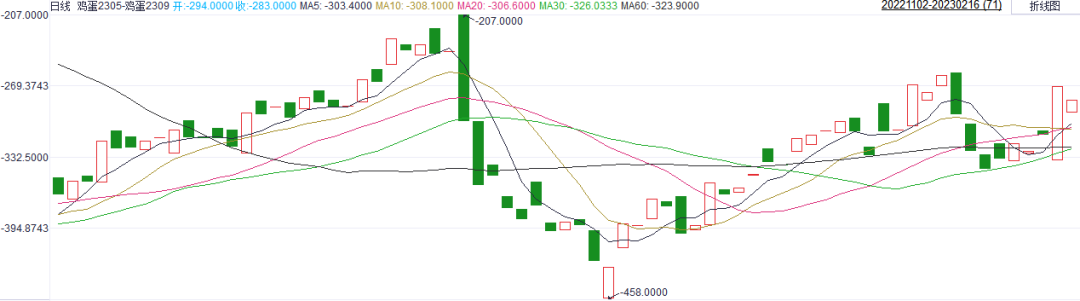 节前鸡蛋需求有所恢复,加之疫情管控放松市场需求有所回暖,远期09合约不确定性较强,总体走势或较近月合约偏弱。另外,从近10个交易日差价走势来看,近远期合约差价总体走高,预期二者差价未来仍有走强的可能。