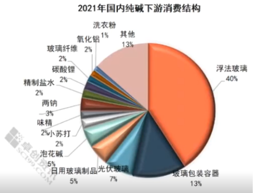 无疑,光伏玻璃的需求成为了资本市场炒作纯碱价格的一个理由,预计2022年光伏玻璃日熔量增加2-3万吨,光伏玻璃对重碱用量有望增加40%左右。我国纯碱主要用于生产浮法玻璃、光伏玻璃、日用玻璃、无机盐、合成洗涤剂、印染、冶金等行业,经过2021年光伏产业的快速发展,我国光伏玻璃在纯碱下游的消费占比提升了2个百分点,如下图所示。