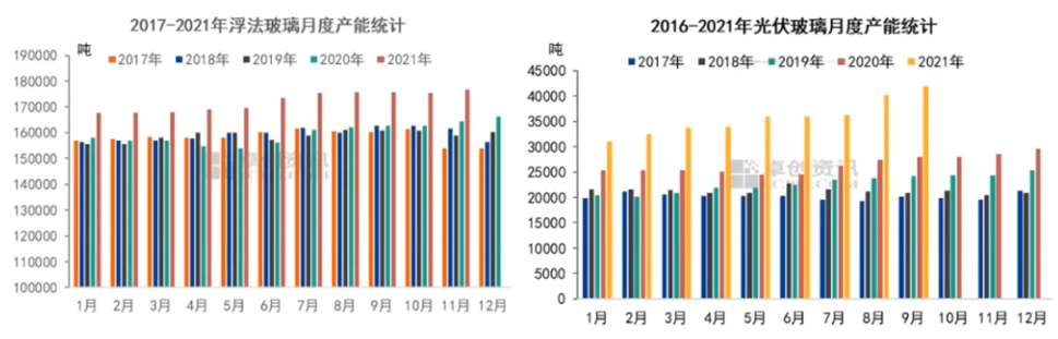我国大部分纯碱主要用于生产玻璃制品,多数时间重碱价格同平板玻璃产能呈正相关关系,且重碱价格波动滞后于平板玻璃产能的变动。2020年5月份开始,平板玻璃产能增幅扩大,重碱价格震荡上行。今年以来,我国浮法玻璃的月度产能同比出现大幅增长,截至2021年11月底,全国浮法玻璃生产线共计307条,在产266条,日熔量共计176775吨,环比上月增加1350吨,环比降0.77%,同比增加7.84%;相比之下,我国光伏玻璃的产能增长更加迅猛,截至2021年11月底,国内超白压延玻璃在产基地36个,窑炉67座,生产线231条,日熔量为41260吨,环比减少4.18%,同比增加44.22%,如下图所示。