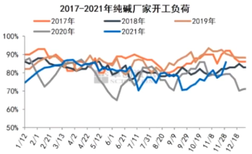 我国纯碱企业的生产同样受到了去年疫情的影响,2017-2019年我国纯碱装置开工负荷在76%-93%波动,2020年开工负荷明显下调。受到去年低基数的影响,据国家统计局数据,今年1-10月份我国纯碱产量2414.7万吨,同比增长5.8%。由于生产工艺的原因,我国纯碱生产的季节性比较强,夏季检修厂商较多,冬季检修较少。在生产生活恢复的2021年,今年1-5月份开工负荷有所提升,6月开工明显下调,受到今年夏季我国极端天气的影响,7-8月上旬我国纯碱开工低于往年同期水平,随着天气转冷,同时动力煤和电力的供应情况好转,近日我国纯碱的开工水平明显上升,如下图所示。据卓创统计,2021年1-11月份我国纯碱平均开工80%,同比提升1个百分点。