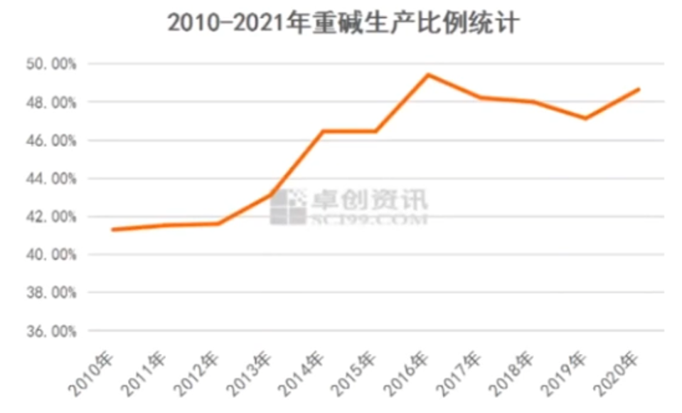 2015年启动供给侧改革之后,从2017年起,受到房地产需求拉动影响,我国浮法玻璃和纯碱产能再度扩张。值得注意的是,随着需求结构的变化,近年纯碱企业不断调整轻碱和重碱的生产比例,今年1-11月中旬重碱生产比例已经提升至54%,几乎是历史最高水平,全年预计重碱产量1566万吨,同比增长14%,如下图所示。