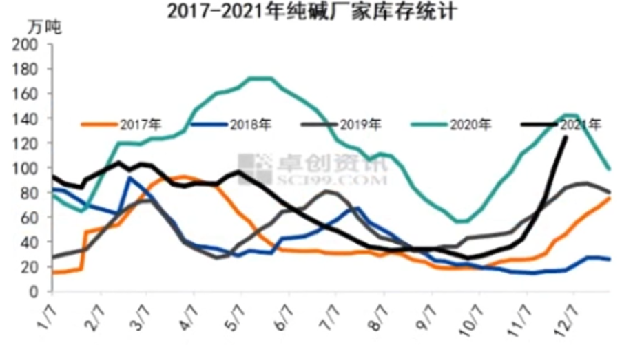由于我国纯碱产能的扩张幅度受到种种限制,而纯碱的需求被市场寄予了过多的期待,同时受到我国纯碱企业开工率的影响,我国纯碱企业的库存在经历了夏季的明显去库后,近期纯碱库存再次超出5月的历史高位,再创新高(排除2020年的特殊情况),如下图所示,远远超出了过去五年的平均水平(排除2020年的特殊情况)。据统计,2017-2021年纯碱厂家库存在16-172万吨之间波动,平均在64.8万吨。