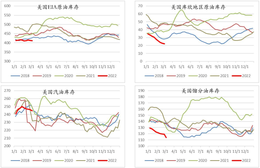 俄罗斯与乌克兰发生军事冲突后,目前局势有所缓和,但是经济制裁已经对市场产生了明显的影响。3月8日,美国总统拜登正式签署了禁止美国从俄罗斯进口能源的行政令。国际油价自俄乌战争爆发后首次下跌。因为美单独宣布能源禁令,表明了欧洲不会跟随美国在能源上制裁俄罗斯。当地时间3 月 15日,英国政府宣布对俄罗斯进行新的经济制裁。制裁的主要内容包括:英国将拒绝对俄罗斯和白俄罗斯的数百种出口产品实施最惠国关税,阻止两国从世贸组织获益;英国政府公布了价值9亿英镑(包括伏特加)的初步商品清单,除了目前的关税外,这些商品还将面临35%的额外关税;英国将与七国集团一起禁止向俄罗斯出口奢侈品。3月20日,法国宣布冻结俄罗斯央行220亿欧元资产。从供给来看,目前OPEC+减产协议整体有序推进,暂时未看到崩盘和大幅度增产的可能。随着剩余产能的枯竭,市场供给愈发的缺乏弹性。OPEC+在2020年4月会议决定减产970万桶/日,2020年5月开始执行,后续视需求的回升情况增加产量;截至2022年3月OPEC+实际协议减产量已经降至256万桶/日,目前已经处于本轮减产的后期。目前全球剩余产能主要集中在以沙特、阿联酋和伊朗少数几个国家手中,Rystad Energy的数据显示,2月份全球原油剩余产能为668万桶/天,其中OPEC减产成员国剩余618万桶/天,占92.5%, 以俄罗斯和哈萨克斯坦为首的OPEC+(非OPEC)成员国仅剩余21.8万桶/天,市场上除了伊朗、利比亚、委内瑞拉因不需要履行减产义务,尚有160万桶/天的剩余产能外,全球其它地区的产能仅剩余不足30万桶/天,基本上均处于满负荷运转的状态。3月初市场传言,伊核谈判一度接近达成,同时市场也传出放开委内瑞拉制裁的相关消息。目前,伊朗原油产量为248.8万桶/天,剩余产能116.5万桶/天,同时尚有近一亿桶的在岸和浮仓库存,若伊朗原油入市,可令当前供给偏紧的局面得到一定的缓解。从当前的局势来看,即使协议达成,实施也要等上几个月。当地时间3 月伊朗石油部长贾瓦德·奥吉19日表示,伊朗拟按照年度预算将原油和凝析油出口量提升至最高每日140万桶,同时拟提高原油和凝析油产能。他告诉伊朗国家电视台,伊朗议会决定将最高日出口量从120万桶增加至140万桶,伊朗石油部“将尽其所能实现这一预算中设定的水平”。路透社报道,由于遭到美国制裁,伊朗方面没有公布其具体原油销售量。奥吉还告诉国家电视台,伊朗石油部拟将原油和凝析油的产能从每日370万至400万桶增加至每日570万桶,但他没有披露实现这一目标的时间表。当前欧盟尚未就制裁俄罗斯原油达成一致,德国仍对制裁俄罗斯石油持有反对态度。目前原油现货贸易商因担心制裁,一直避免采购俄罗斯原油。目前俄罗斯原油产量为1100万桶/天,出口量为465万桶/天,其中约有230万桶/天出口到欧洲地区,同时还有150万桶/天的成品油,而出口到美国地区的仅有 20 万桶/天左右,因当前贸易商避开采购俄罗斯原油,将导致市场市场上约380万桶/天的短期缺口,如下图所示。当前欧洲考虑禁止采购俄罗斯原油,若一旦开始实施,即便伊朗原油入市也难以改善原油供给偏紧的格局,同时也意味着一旦有明确的信号欧盟把俄罗斯原油排除在制裁之外,短期出口受限的这部分俄罗斯原油将快速的进入石油市场,对原油价格造成较大的冲击。2月OPEC产量相比额定产量减少67.8万桶/日,主要由于尼日利亚、安哥拉等国油气投资不足导致。近几年美国油气投资数据明显回落,页岩油企业增产意愿不强。一方面许多页岩油企业在上一轮市场繁荣期时大幅举债,用于钻探新油井,而在油价下行之后,一些小型页岩油公司因无力偿还债款宣告破产。另外美国当前的高通胀率也让页岩油公司不得不保持谨慎,高昂且稀缺的钻探设备与劳动力压制了页岩油增长需求。近几年美国油气投资数据明显回落,页岩油企业增产意愿不强。一方面许多页岩油企业在上一轮市场繁荣期时大幅举债,用于钻探新油井,而在油价下行之后,一些小型页岩油公司因无力偿还债款宣告破产。另外美国当前的高通胀率也让页岩油公司不得不保持谨慎,高昂且稀缺的钻探设备与劳动力压制了页岩油增长需求。当前,美国、日本等国的原油库存,基本上均维持在历史低位,如下图所示,同时仍处于去库周期,低库存仍将支撑油价。德国和法国的库存石油都只能够维持130天左右,这就意味着以德法为主导的欧盟不会持续在能源出口上限制俄罗斯,或者说采取过于强硬的制裁措施导致俄罗斯切断能源供应。另一方面,美国在2020年4月国际油价较低时储备了大批原油,中国也在2020年疫情期间进行了原油储备工作。如果国际油价长期居高不下,中美都可能释放原油储备来稳定能源市场。且中国与伊朗、俄罗斯的石油合作协议都是长期合同, 国内价格受短期市场波动的影响较小。全球经济疫后恢复带来的快速增长基本结束,经济增速放缓预示原油需求增速逐渐下降。经历了2020年的“疫情衰退”后,全球经济增长在2021年反弹至5.5%,但今年将放缓至低于预期的4.1% ,然后在2023年进一步放缓至3.2%。随着近期形势缓和而且俄罗斯目前并未受到欧盟直接的能源制裁,全球能源紧张担忧情绪有所缓解,随着OPEC+延续增产以及伊朗原油回归预期兑现,全球原油供需结构将逐渐转换为缓慢累库过程,3月9日的前高点有可能成为短期内的强力压力位,短期再次在该压力位
