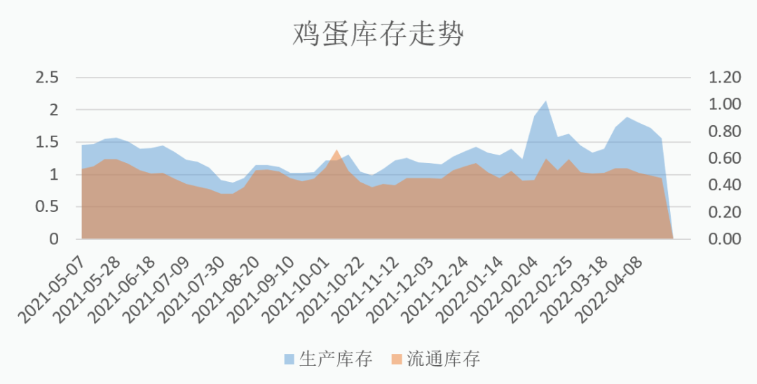 与淘汰减少对应的是当前新开产蛋鸡也处于逐步减少状态,整体上能维持当前产能不出现大的波动情况,所以产能缺口统计将出现偏差。虽然目前阶段养殖利润整体并不差,但3月份蛋鸡补栏情况处于正常偏低水平,那么从目前鸡苗价格回落,种禽企业入孵率降低的情况下不难看出目前阶段补栏大概率是低迷期,这与历史规律差异较大,反映出产业对后市行情的担忧,或者说是饲料成本较高对补栏积极性产生压制效果,目前情况看后续补栏情况大概率也将维持较低水平。结合淘汰和补栏情况可以看出,当前存栏也难有大幅增加可能,同时也很难出现再次降低的情况,除非这波行情过后鸡价出现回落导致大量淘鸡时,存栏可能出现小幅减少,整体上降对产能恢复造成一定负面影响。2、库存方面:本周整体库存出现回落,生产库存为1.56天,减少0.16天,贸易库存为0.94天,减少0.05天,降库存也是维持当前蛋价高位的一个因素,同时要注意当前贸易库存还是不算高,但生产库存虽然有下降,但也处于相对较高水平,这与贸易商的谨慎情绪和养殖朋友的被动累库息息相关,背后都是由于疫情引起,前者是担心高价难销风险,后者是由于交通受阻不得不产生库存。那么后续疫情防控恢复正常,库存大概了也将保持继续下降情况,后续关注贸易库存变化。3、消费需求:这里需要提一下国外禽流感疫情导致的多国蛋价猛涨,这种情况也会间接利好国内蛋价,影响较小但不能说完全没有影响,主要看出口数据,历年我国很少出口鸡蛋,但今年的出口量确实处于同期高位,这要看贸易商或者出口商的利润,综合考虑出口和国内内销的成本,利润驱动下就会增加出口。