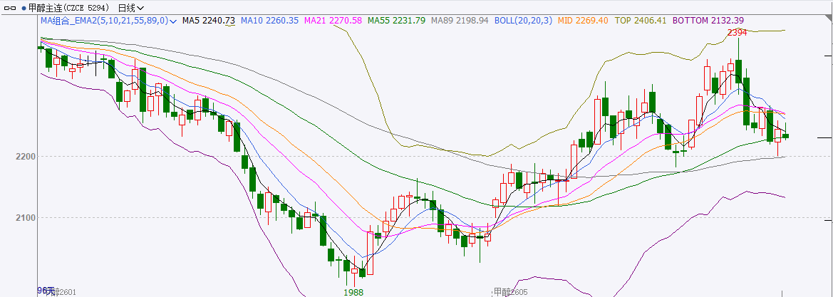 截至前一个交易日收盘,甲醇震荡,主力收阴线。