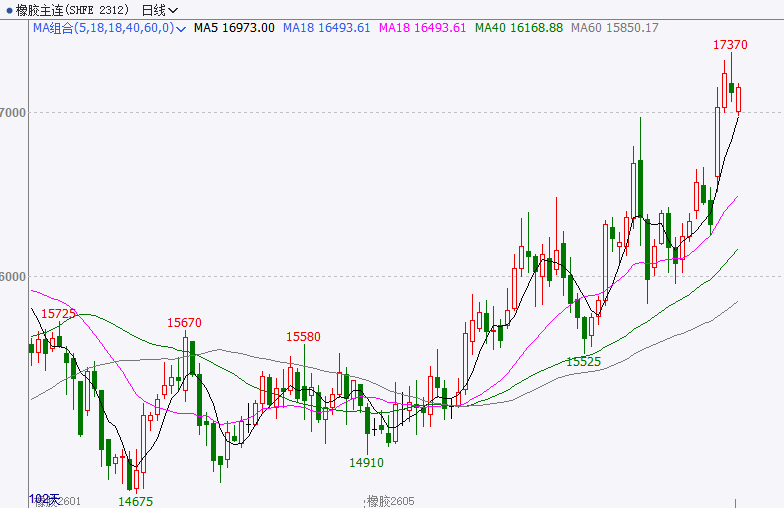 走势分析:今日行情震荡上行,全球产区进入停割期,后续震荡偏强概率较大,下方支撑位参考16600附近,上方压力位参考17600附近。