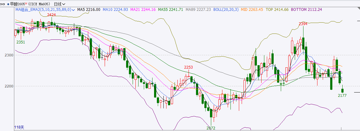 截至前一个交易日收盘,甲醇震荡,主力收阴线。