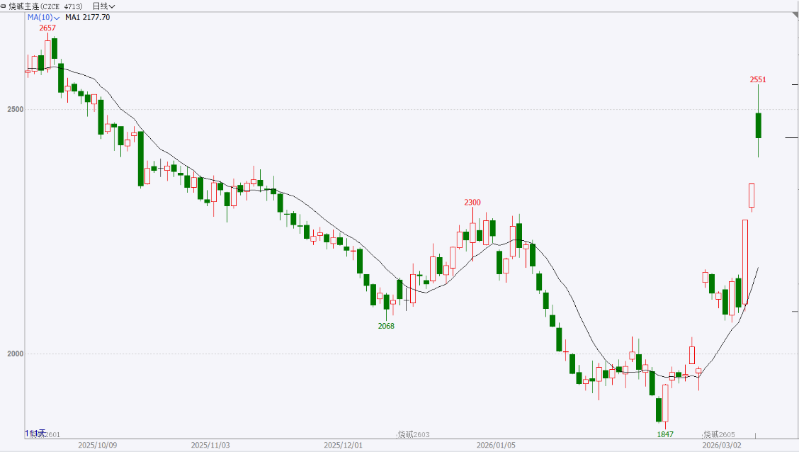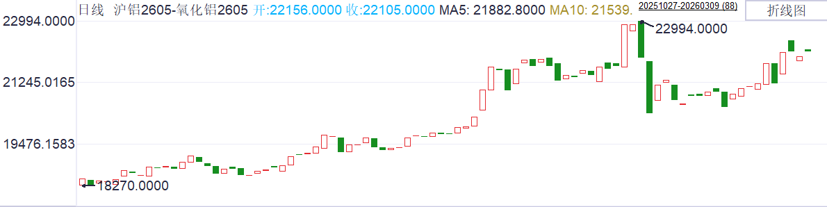 走势分析:中东局势升级引发市场对全球能源及化工供应的担忧,叠加国外PVC装置降负导致烧碱被动减产,部分海外需求转向中国,出口乐观预期升温。与此同时,国内化工板块整体走强形成板块轮动效应,进一步助推盘面表现。但上行空间仍受制于去库节奏与氧化铝需求恢复力度,需注意追高风险。