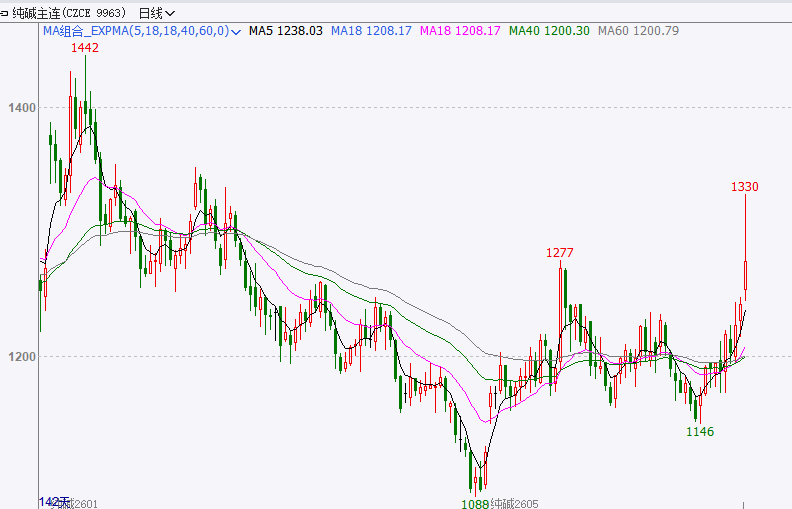 截至前一个交易日收盘,纯碱主力合约大幅上涨,收中阳K线。