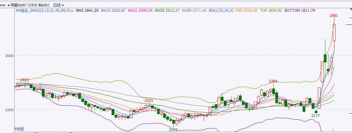截至前一个交易日收盘,甲醇大幅上涨,日内收阳线。