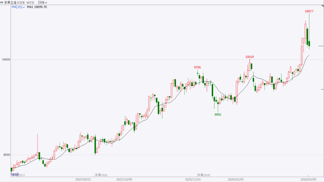 截至前一个交易日收盘,苹果主力合约日内小幅下跌,涨势钝化。
