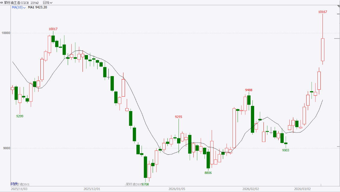 走势分析:ICE油菜籽持续走高对国内形成成本端牵引,叠加中东局势紧张引发的原油上涨外溢,为油脂板块提供情绪支撑。从基本面看,国内油厂压榨节奏温和,沿海库存未出现明显累积,现货基差维持平稳。展望后市,在外盘强势与原油高波动的背景下,菜油或延续震荡偏强格局。