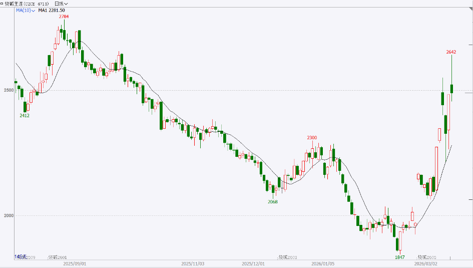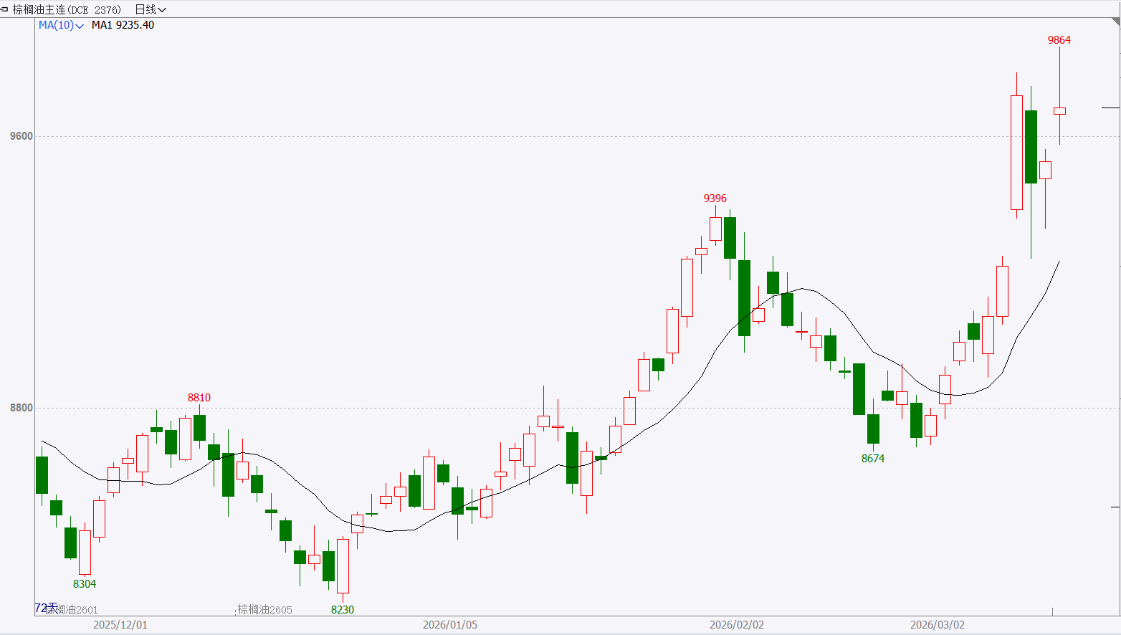 走势分析:3月上旬马棕出口环比大幅增长,为远期价格提供底部支撑;同时,原油价格在连续回调后逐步企稳,地缘情绪趋于稳定,带动生物柴油需求预期修复。从基本面看,马棕2月库存虽高于预期,但去库趋势延续,对盘面压制有限。展望后市,出口改善与原油波动仍是短期核心变量,棕榈油或以高位震荡为主。
