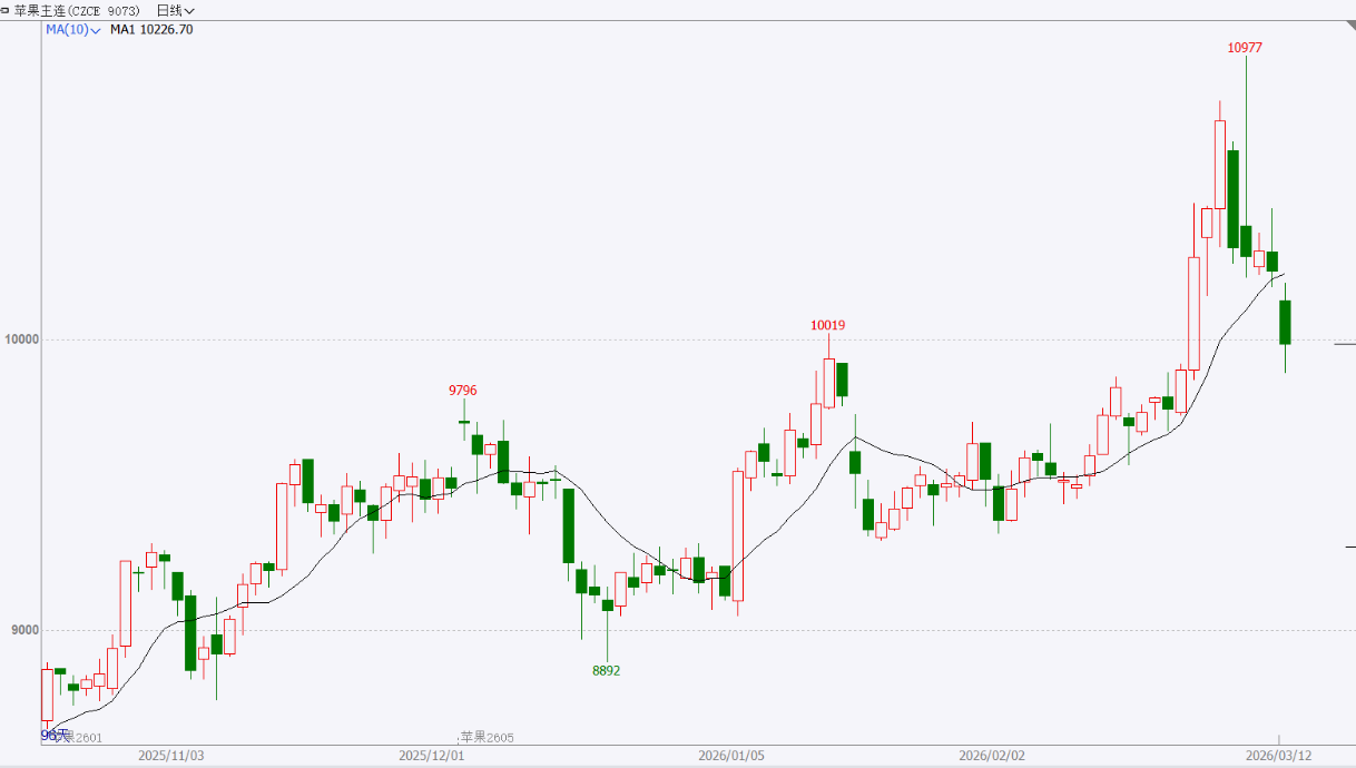 走势分析:从供需层面看,尽管产区好货价格维持坚挺,但市场对高价货源接受度下降,清明备货行情对盘面的提振作用边际减弱。与此同时,销区反馈显示终端走货未见明显提速,库存去化节奏偏慢,前期低库存驱动的利多情绪逐步释放。展望后市,随着天气转暖,水果替代品陆续上市,苹果消费面临分流压力,需求端支撑或进一步弱化,价格存在走软可能。