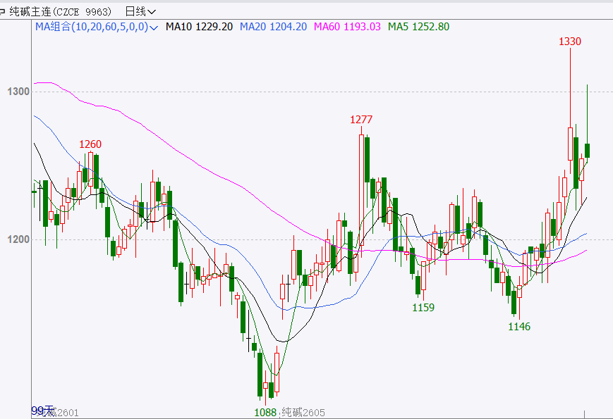 截至前一个交易日收盘,纯碱主力合约冲高回落,小幅上涨1.05%。