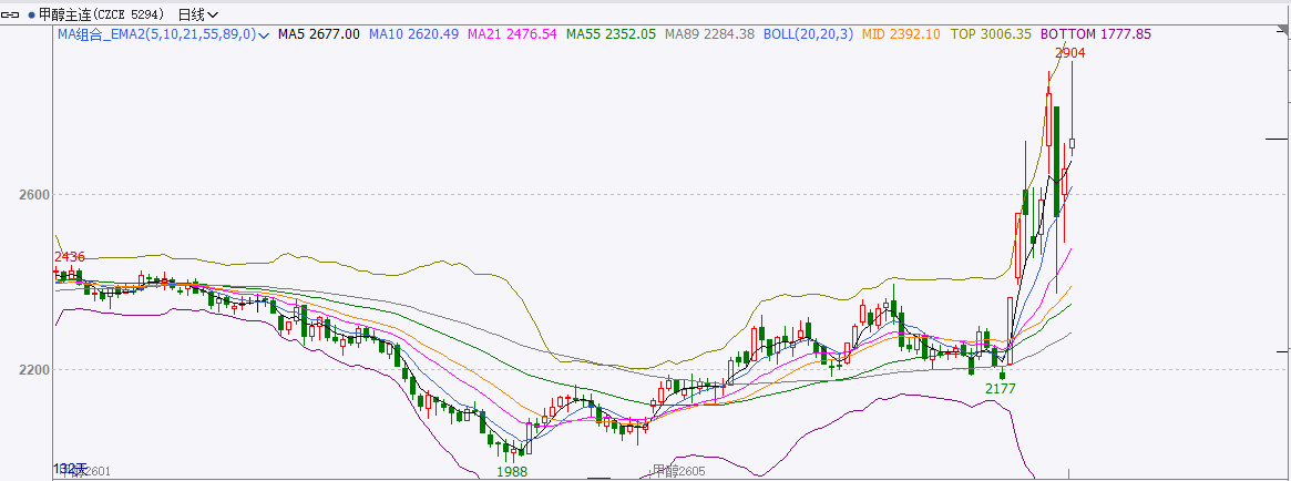 截至前一个交易日收盘,甲醇大幅波动,日内收阳线。