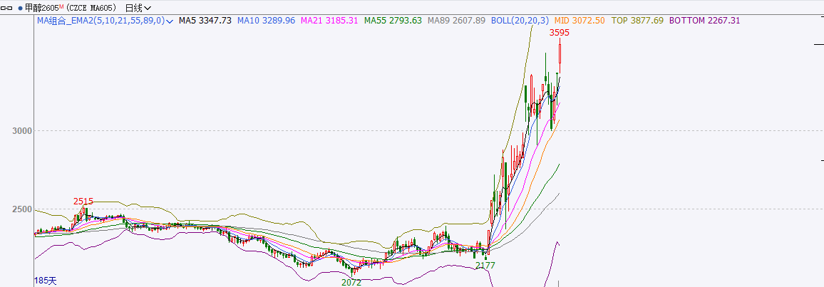 截至前一个交易日收盘,甲醇大幅,日内收阳线。