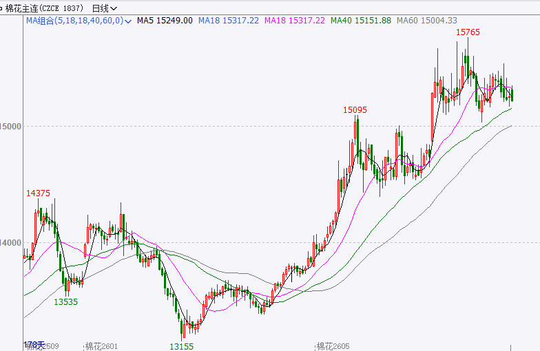 走势分析:今日行情偏弱震荡,棉花供应宽松,后续有望震荡偏弱运行,下方支撑位参考15000附近,上方压力位参考15550附近。