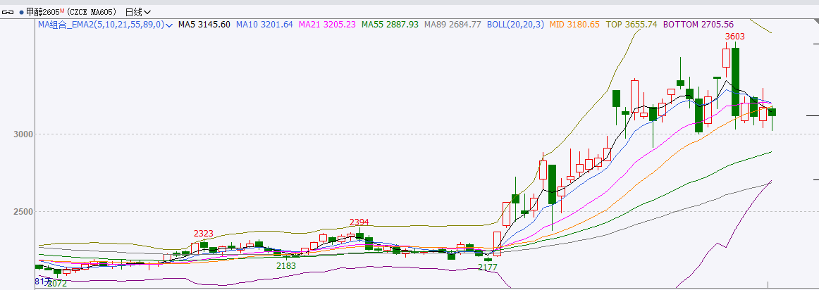 截至前一个交易日收盘,甲醇下跌,日内收阴线。