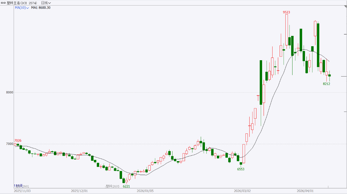 走势分析:美伊谈判破裂,美国宣布封锁伊朗港口,国际油价暴涨,能化板块获得成本端强力提振。基本面方面,国内石化装置检修维持高位,中东进口货源因运输受阻而减量,供应端实质性收紧;需求端则相对偏弱,下游对高价货源接受度较低,以刚需采购为主。总体而言,地缘风险溢价是短期主导力量,塑料短期或维持高位运行,但需警惕情绪过度透支后的回调风险。