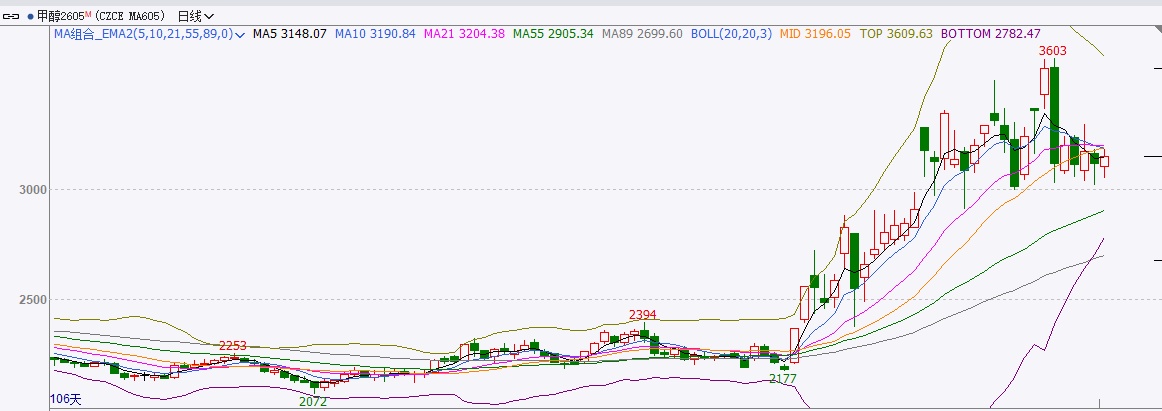 截至前一个交易日收盘,甲醇震荡,日内收阳线。