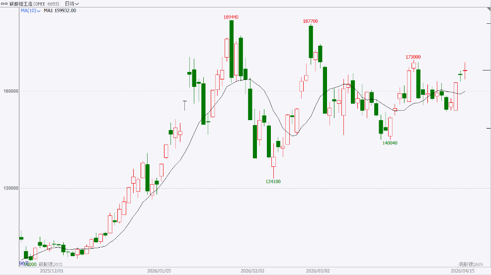 走势分析:前期由供应端扰动引发的情绪溢价已基本消化,市场重新聚焦于长期供需宽松格局。近期盘面呈现宽幅震荡特征,多空博弈较为激烈,但基本面并未出现实质性改善。供给端,海外矿山投产推进顺利,中长期产能释放预期较为明确;需求端,下游采购维持谨慎,补库力度有限,对高价货源接受度较低。展望后市,在供过于求的大背景下,碳酸锂长期价格中枢或仍面临下行压力,短期则延续震荡反复格局。