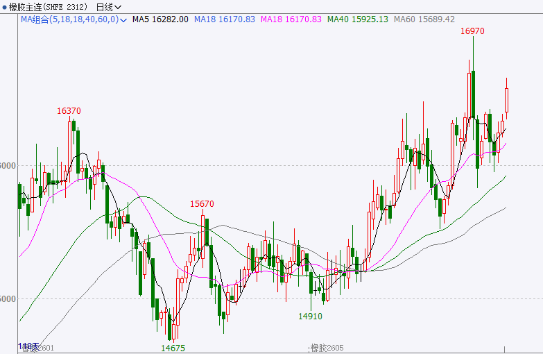 走势分析:今日行情突破近期压力位,全球天然橡胶供应季节性收缩,短期供应端支撑较强,后续震荡偏强概率较大,下方支撑位参考16200附近,上方压力位参考16800附近。