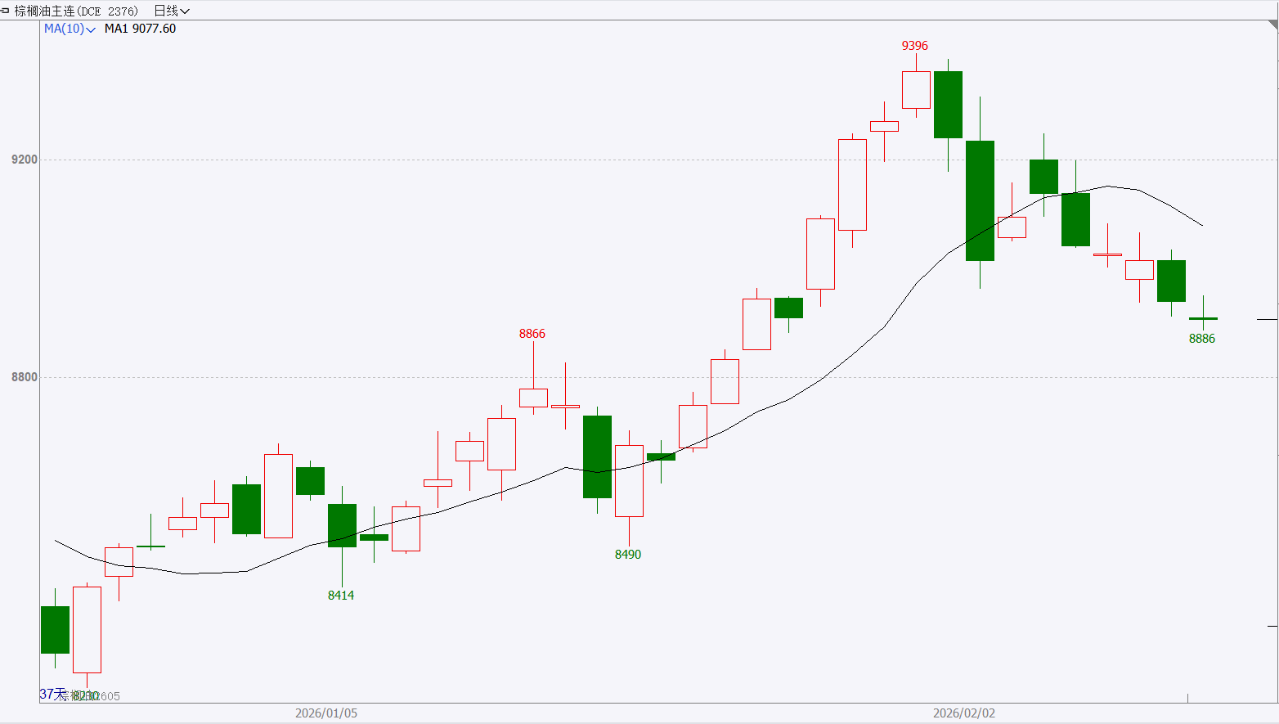 截至前一个交易日收盘,棕榈油主力合约小幅下跌,延续回调。