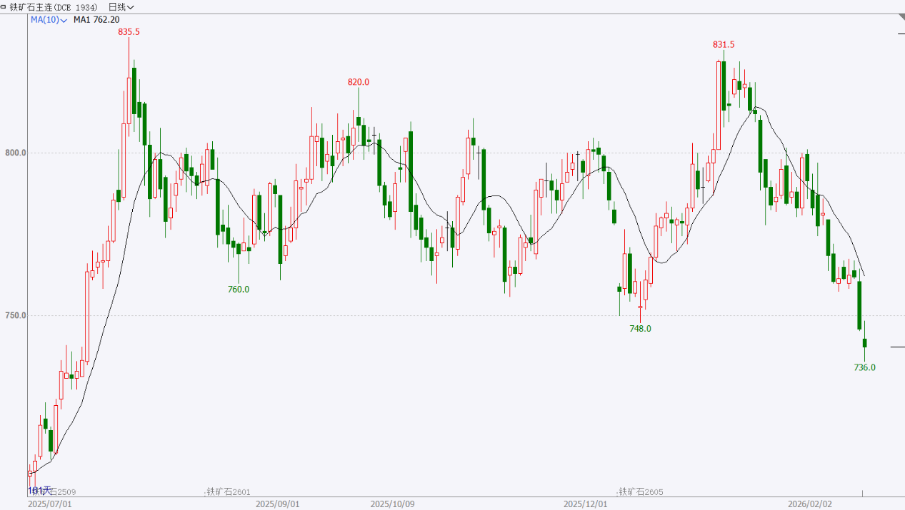 走势分析: 供应端维持宽松格局,港口库存处于相对高位;需求端则呈现阶段性放缓,节前钢厂补库已至季节性高位,节后多以消耗厂内库存为主,大规模采购尚未启动。此外,终端钢材需求恢复节奏存在不确定性,进一步压制了上游原料的表现。预计铁矿后市仍有回落空间。