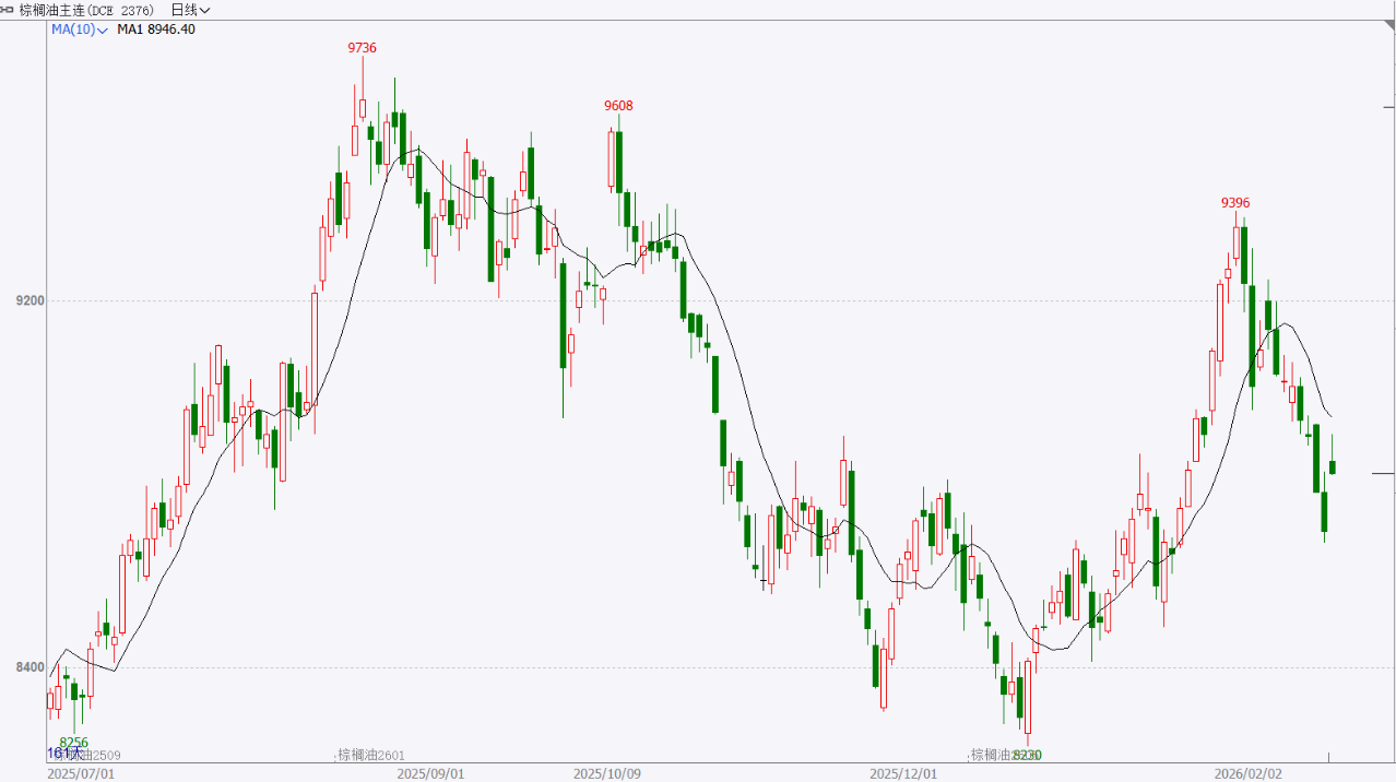 截至前一个交易日收盘,棕榈油主力合约高开低走,整体延续回调。