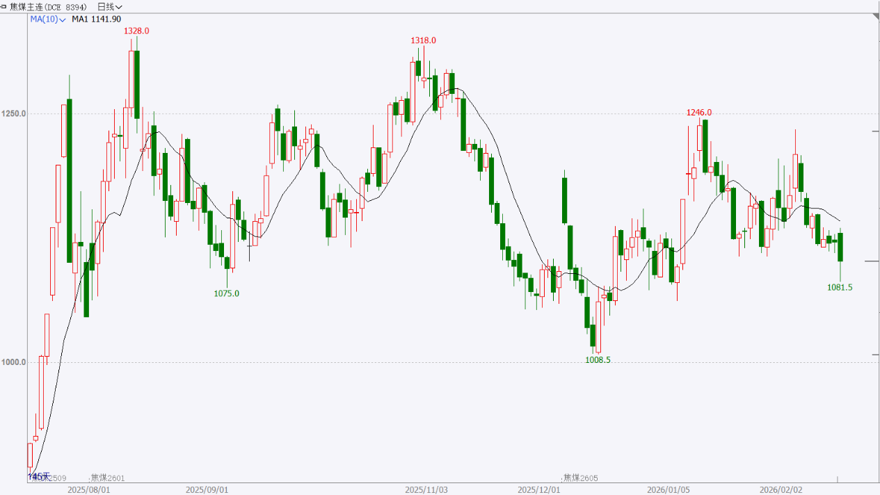 截至前一个交易日收盘,焦煤主力合约震荡下行,收小阴K线。