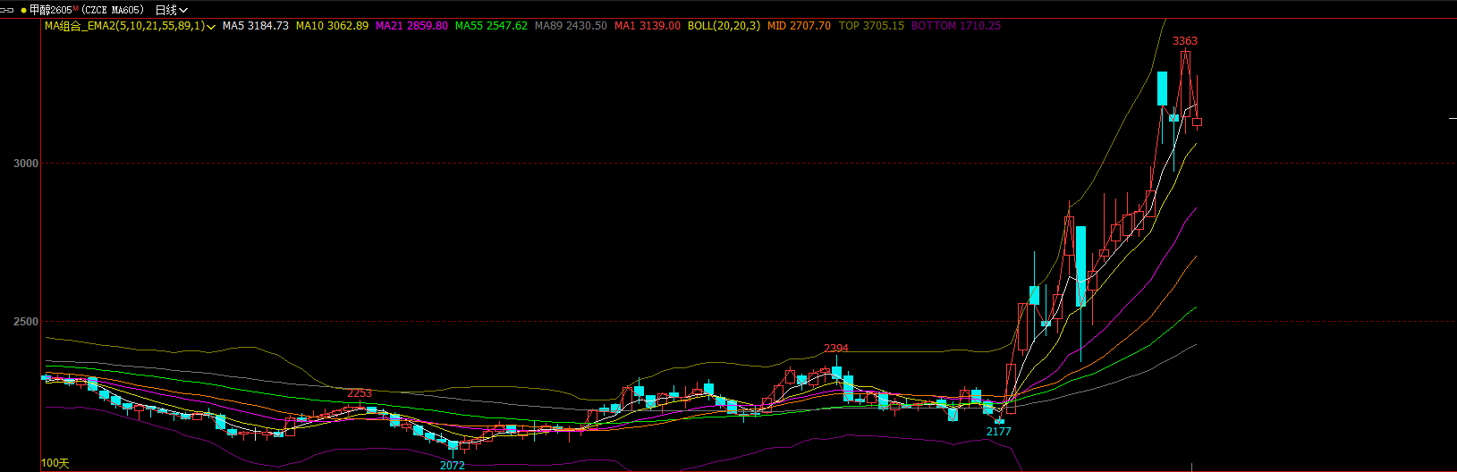 截至前一个交易日收盘,甲醇高位震荡,日内收阳线。