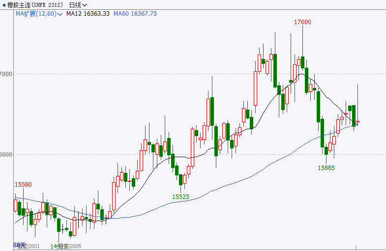 截至前一个交易日收盘,橡胶主力合约冲高回落,收小阳K线。