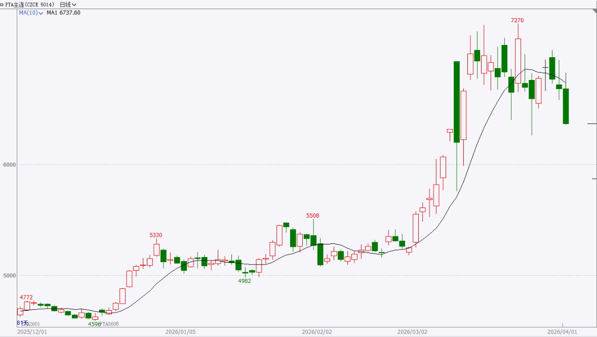 走势分析:美伊释放缓和信号削弱了前期能化板块的风险溢价,国际油价高位回落,成本端支撑有所松动。与此同时,终端订单表现疲弱,聚酯长丝减产幅度扩大,产销持续低迷,负反馈向上传导,对PTA价格形成拖累。展望后市,在地缘因素与需求疲弱的博弈下,PTA短期或转入偏弱震荡格局。