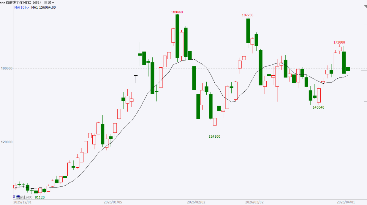 走势分析:前期由供应端扰动引发的情绪溢价已基本消化,市场重新聚焦于长期供需宽松格局。近期盘面呈现宽幅震荡特征,多空博弈较为激烈,但基本面并未出现实质性改善。供给端,海外矿山投产推进顺利,中长期产能释放预期较为明确;需求端,下游采购维持谨慎,补库力度有限,对高价货源接受度较低。展望后市,在供过于求的大背景下,碳酸锂长期价格中枢或仍面临下行压力,短期则延续震荡反复格局。