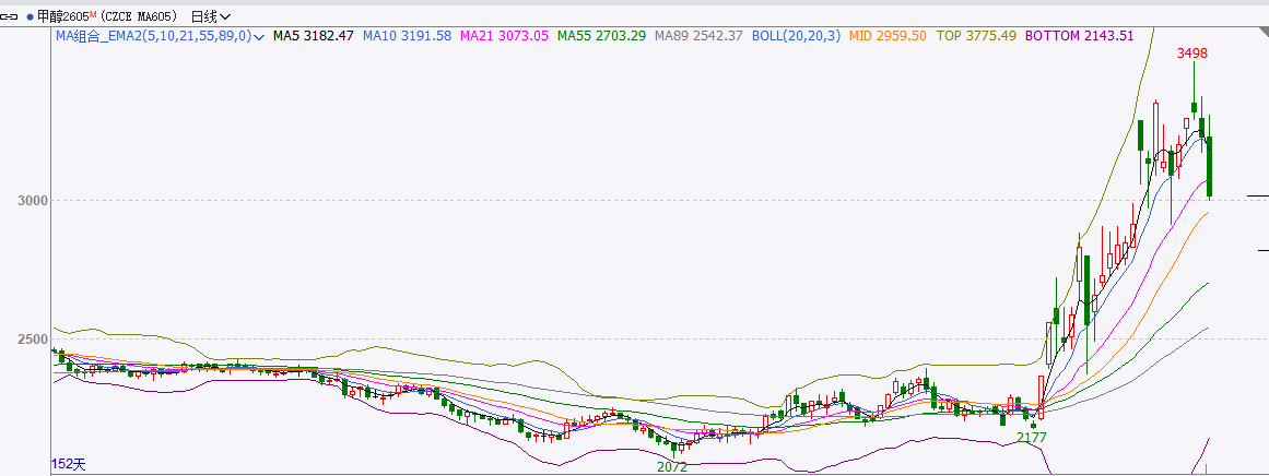 截至前一个交易日收盘,甲醇继续回落,日内收阴线。
