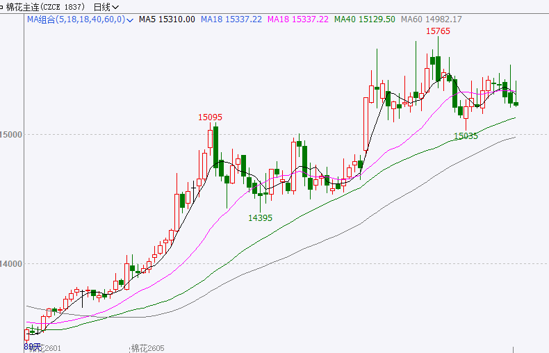 截至前一个交易日收盘,棉花主力合约冲高回落,收小阴K线。