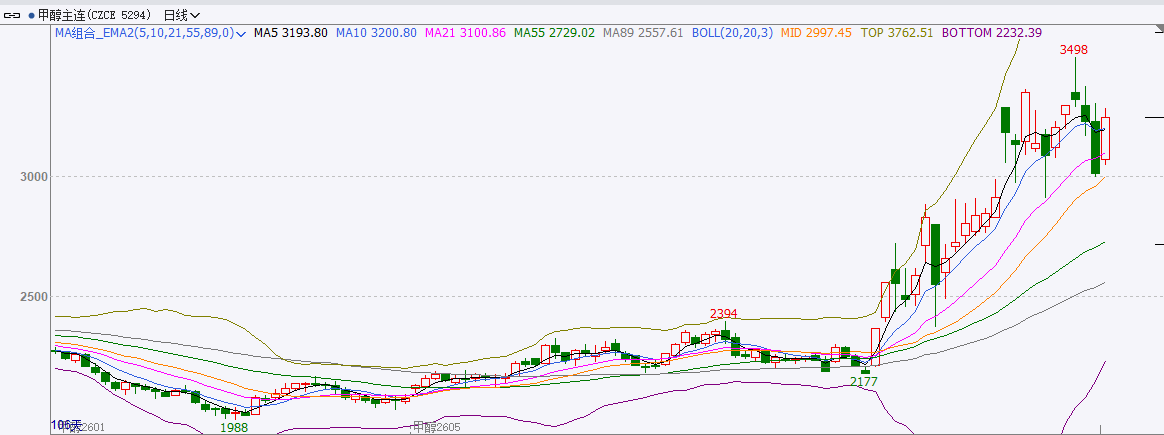 截至前一个交易日收盘,甲醇大幅,日内收阳线。