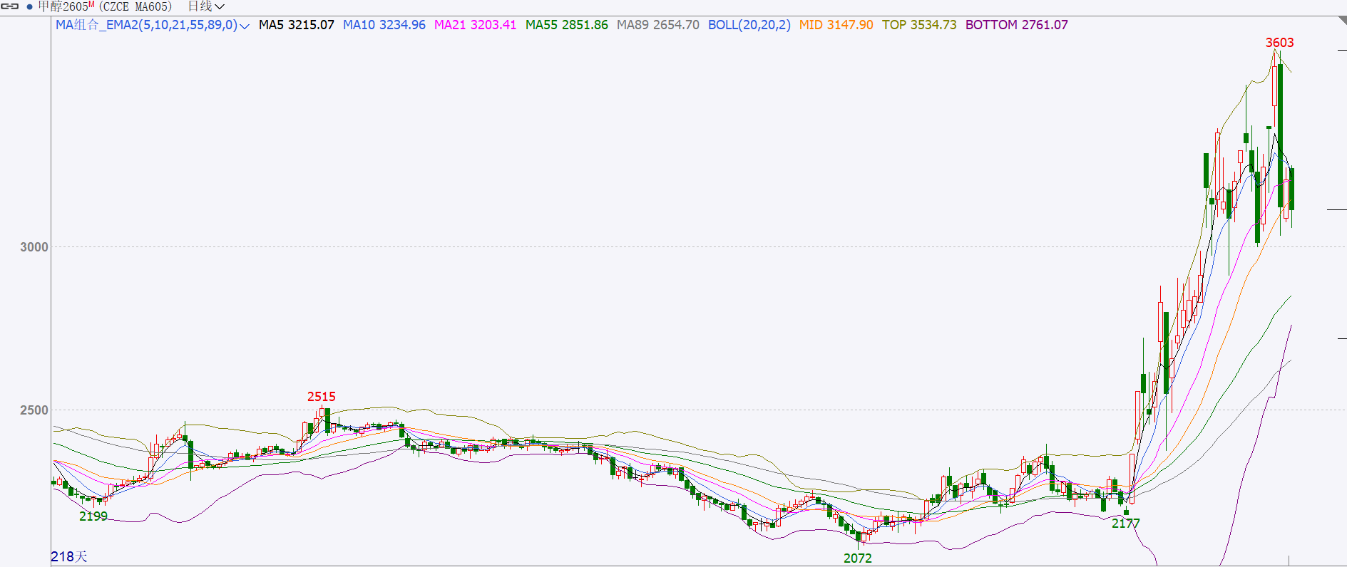 截至前一个交易日收盘,甲醇继续下跌,日内收阴线。