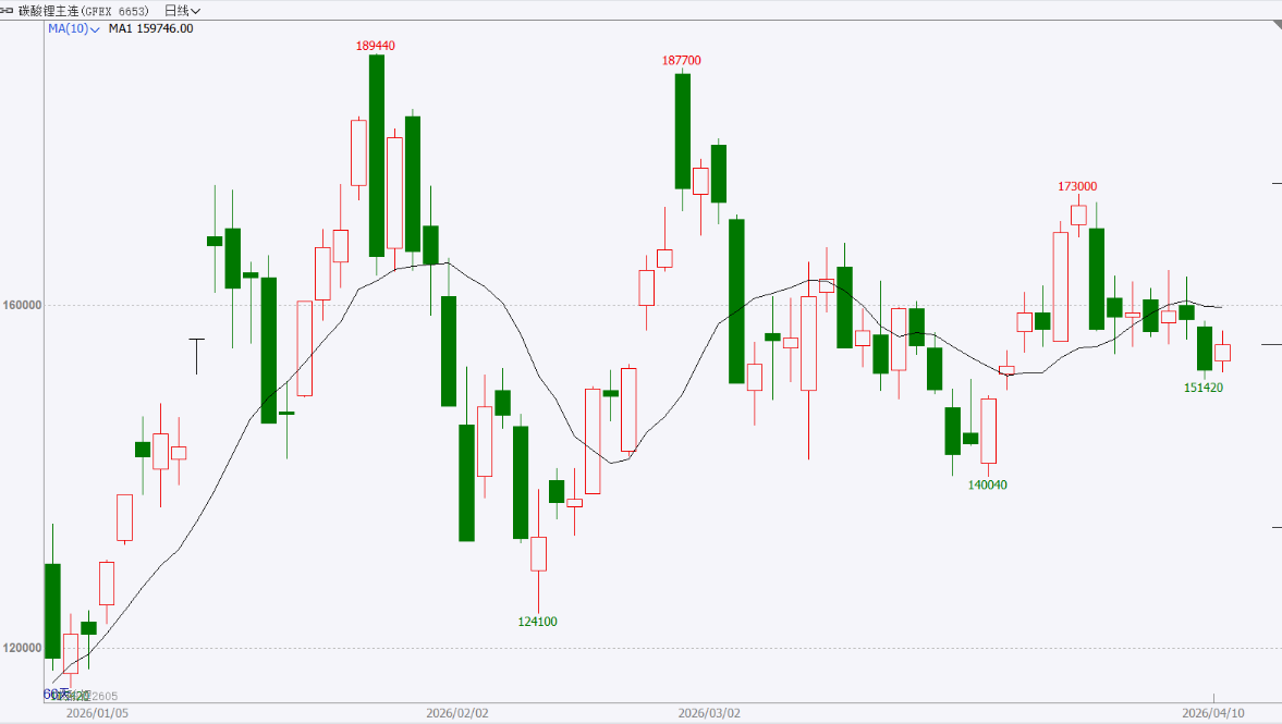 走势分析:前期由供应端扰动引发的情绪溢价已基本消化,市场重新聚焦于长期供需宽松格局。近期盘面呈现宽幅震荡特征,多空博弈较为激烈,但基本面并未出现实质性改善。供给端,海外矿山投产推进顺利,中长期产能释放预期较为明确;需求端,下游采购维持谨慎,补库力度有限,对高价货源接受度较低。展望后市,在供过于求的大背景下,碳酸锂长期价格中枢或仍面临下行压力,短期则延续震荡反复格局。