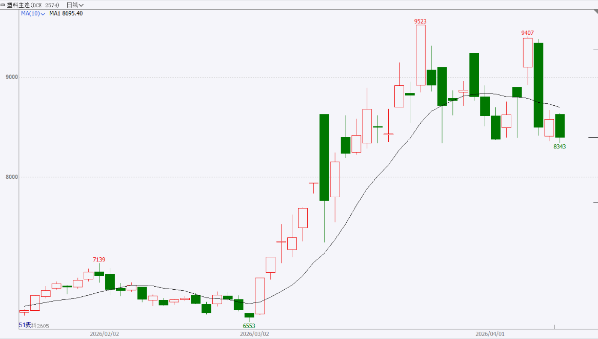 走势分析:美伊达成停火协议后,地缘风险溢价迅速回吐,原油成本驱动逻辑骤然逆转,成本端坍塌形成系统性拖累。从基本面看,国内装置检修规模维持高位,供应端处于偏紧格局,进口受航运风险制约同样偏低。但在市场情绪由供给恐慌切换为需求悲观的背景下,基本面支撑难以对冲成本端崩塌带来的下行压力,塑料与聚丙烯同步大幅回调。展望后市,成本坍塌与供给收缩之间的博弈或将延续,短期以宽幅震荡消化前期跌幅为主。