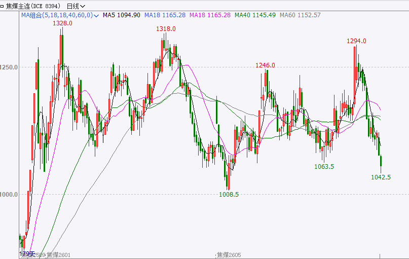 截至前一个交易日收盘,焦煤主力合约跌破日线支撑位,收小阴K线。